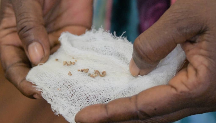 Muonekano wa mawe baada ya kuvunjwa mithili ya mchanga yaliyotoka kupitia njia ya haja ndogo.