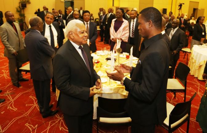 Rais Edgar Lungu wa Zambia akisalimiana na Waziri Mkuu Mstaafu Jaji Joseph Sinde Warioba