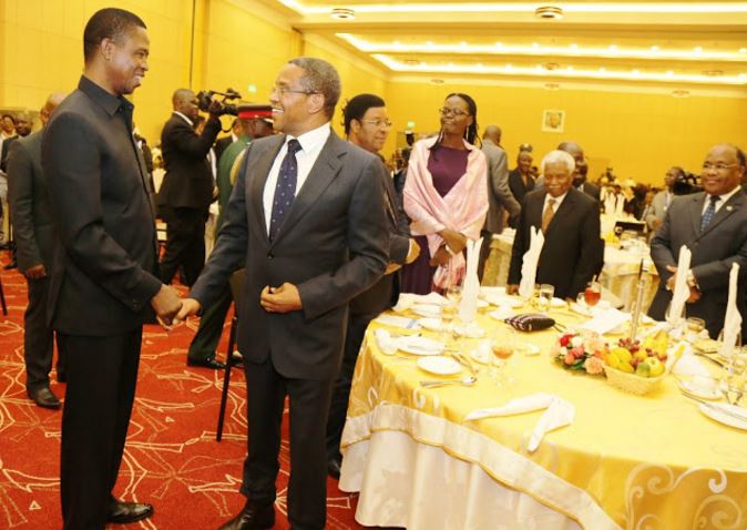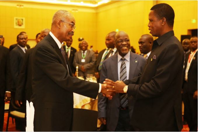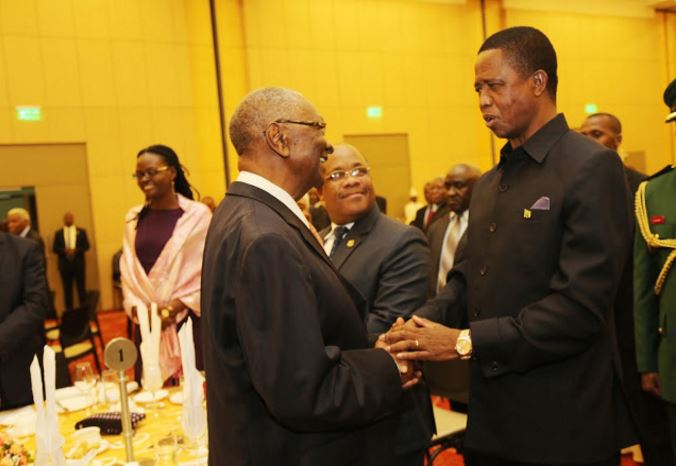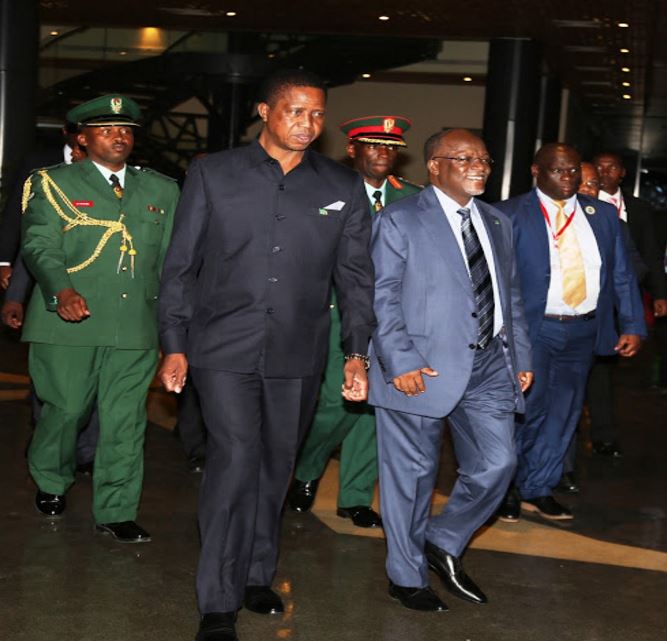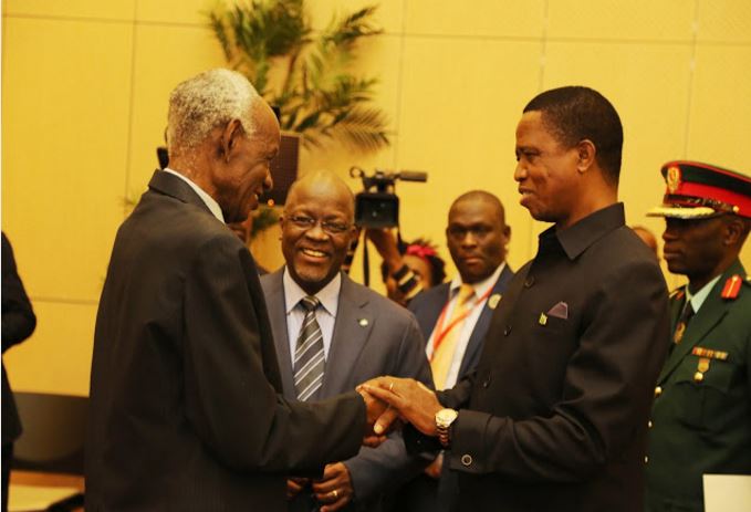 Rais Edgar Lungu wa Zambia akisalimiana na Rais Mstaafu Dkt. Jakaya Mrisho Kikwete