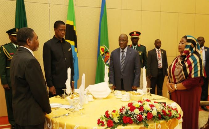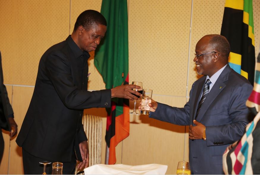 Rais Dkt Magufuli akigonganisha glasi na mgeni wake Rais Edgar Lungu wa Zambia.