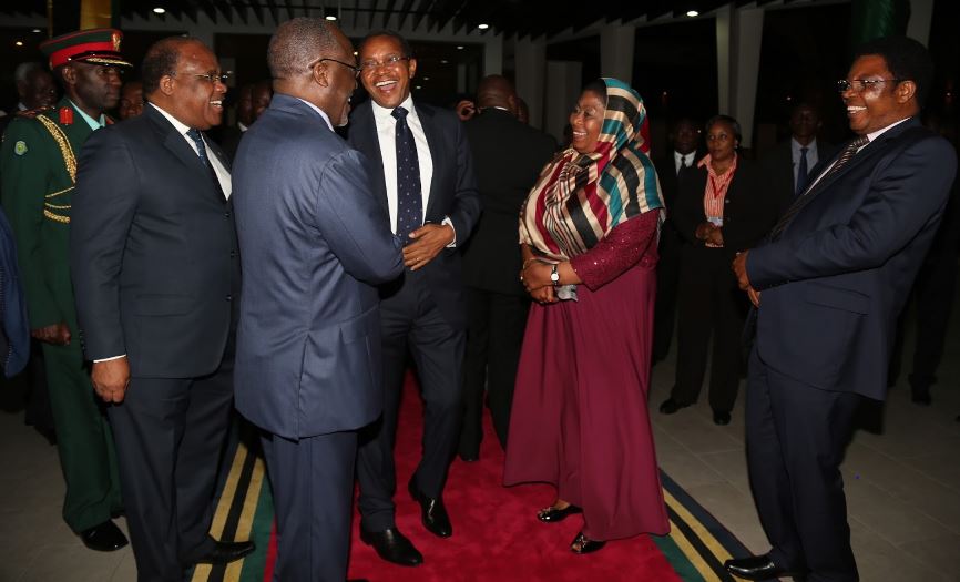 Rais Edgar Lungu wa Zambia akisalimiana na Rais Mstaafu Alhaj Ali Hassan Mwinyi. Kulia ni Naibu Spika Dkt Tulia Ackson