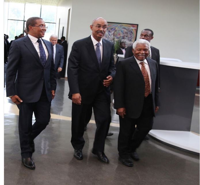 Rais Mstaafu wa awamu ya Pili AlhajAli Hassan Mwinyi,Rais Mstaafu wa Awamu ya nne Dkt. Jakaya Mrisho Kikwete na Rais Mstaafu wa Zanzibar Dkt. Amani Abeid Karume wakielekea kwenye dhifa ya kitaifa iliyoandaliwa na Rais Dkt John Pombe Magufuli kwa heshima ya Rais wa Jamhuri ya Zambia Mhe. Edgar Lungu katika ukumbi wa Ikulu jijini Dar es salaam usiku huu.