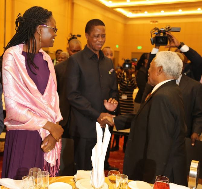 Rais Edgar Lungu wa Zambia akisalimiana na Spika Mstaafu Mhe. Pius Msekwa