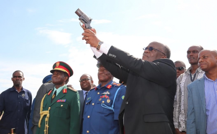 Rais na Amiri Jeshi Mkuu Dkt John Pombe Magufuli akijiandaa kufyatua risasi ya bastola kuashiria matumizi rasmi ya Uwanja wa kisasa wa ndegevita wa Ngerengere mkoani Morogoro Machi 6, 2017