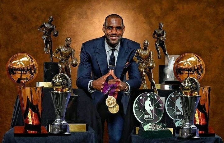 Nyota wa Los Angeles Lakers, LeBron James akiwa na tuzo alizotwaa baada ya kuisaidia timu yake kutwaa NBA.