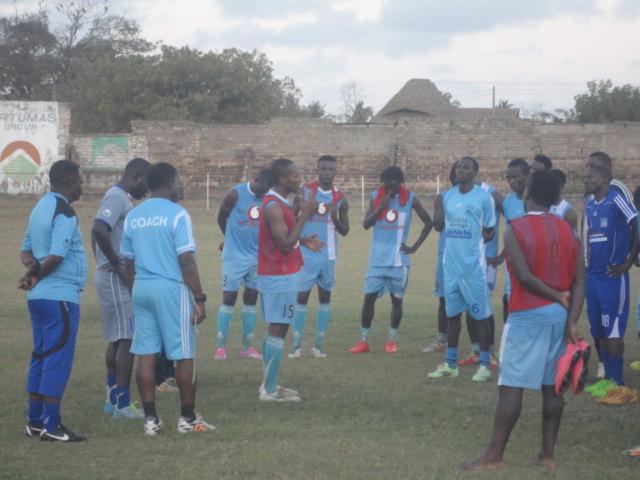 Wachezaji wa timu ya Ndanda Sc ya mkoani Mtwara, wakipokea maelekezo kutoka kwa makocha wao, Hamimu Mawazo (Kocha Mkuu) na Ngawina Ngawina (Msaidizi).