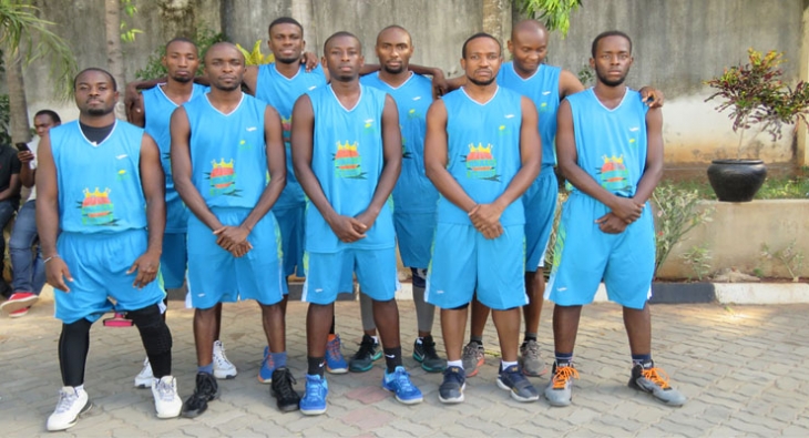 Wachezaji wa timu ya TMT wakiwa pamoja na kocha wao Evans aliyevalia sharti jeupe