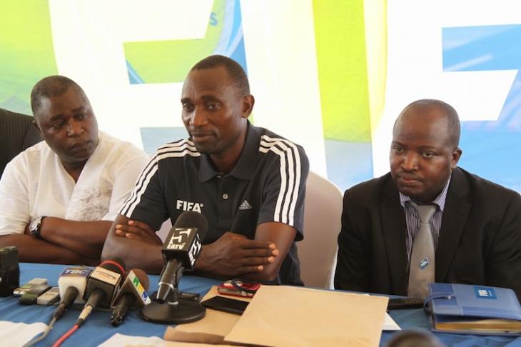 Mwamuzi Israel Mujuni Nkongo wa Dar es Salaam [katikati] akiwa na mabosi wa TFF.