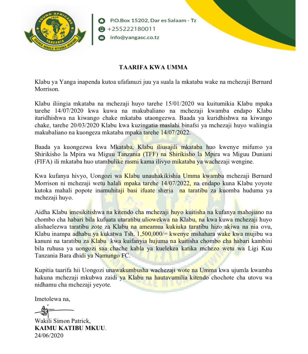 Pia kuhusiana na suala la mkataba wa klabu na mchezaji huyo, Yanga imesema kuwa Januari 15, 2020 klabu iliingia mkataba na Morrison wa kuitumikia klabu hadi Julai 14, 2022 na kwamba hivi sasa ni mali yao.