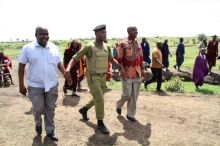 Askari Polisi akiwa amewashikilia ,Mhandisi wa Maji wa wilaya ya Monduli,Charles Saidea (kulia) na Mkandarasi, Ayo Jeremia wa kampuni ya Meru Constructions mara baada ya Naibu Waziri kuamuru wakamatwe.