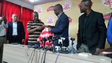 Kocha mpya wa klabu ya Simba, Joseph Omog kushoto akikabidhiwa jezi na Rais wa klabu hiyo Evans Aveva, wakati aliposaini kuifundisha klabu hiyo kwa mkataba wa miaka 2, Julai 1, 2016