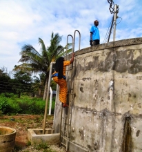 Aliekua Mwenyekiti wa Kamati Ndogo ya Bunge ya Kilimo, Mifugo na Maji Amina Makilagi akipanda ngazi za tanki la maji la mradi wa Maji wa Nanyamba.