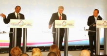 Rais Jakaya Kikwete, waziri mkuu wa Canada Stephen Harper na katibu mkuu wa Umoja wa mataifa Ban Ki-Moon katika mkutano na wanahabari Toronto Canada