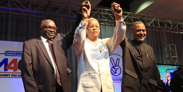 Mgombea urais kwa tiketi ya Chadema, Edward Lowassa (katikati) akiwa ameshikana mikono na mgombea mwenza, Juma Duni Haji (kushoto)