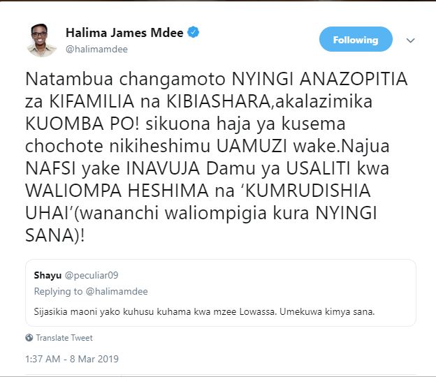 "Natambua changamoto nyingi anazopitia za kifamilia na kibiashara, akalazimika kuomba po! sikuona haja ya kusema chochote nikiheshimu uamuzi wake. Najua nafsi yake inavuja damu ya usaliti kwa waliompa heshima na ‘kumrudishia uhai’"Halima James Mdee.