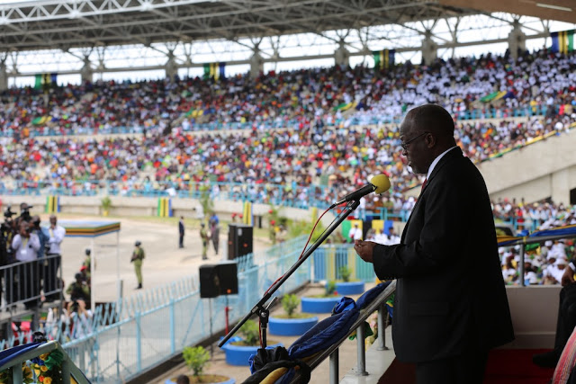 Rais wa Jamhuri ya Muungano wa Tanzania na Amiri Jeshi Mkuu Dkt. John Pombe Magufuli akihutubia wananchi waliojitokeza katika sherehe za miaka 55 ya Uhuru wa Tanzania Bara katika uwanja wa Uhuru jijini Dar es Salaam.