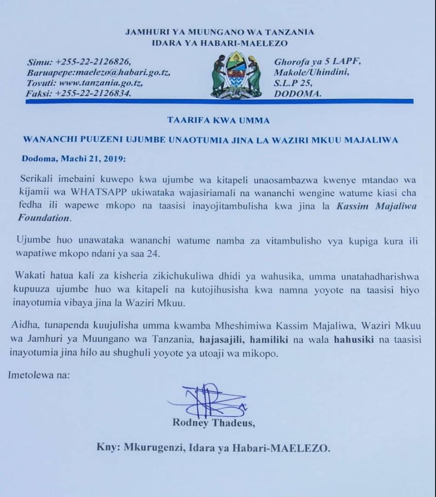 Wananchi wameaswa kupuuza ujumbe huo huku hatua kali za kisheria zikiwa zinachukuliwa kwa wahalifu hao wanachafua jina la Waziri Mkuu.