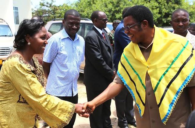 Waziri Mkuu Kassim Majaliwa akisalimiana na Mbunge wa Busanda, Lolesia Bukwimba baada ya kuwasili kwenye Ofisi yaMkurugenzi wa Wilaya ya Chato