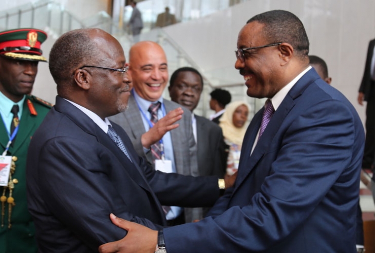 Rais Magufuli akisalimiana na Waziri Mkuu wa Ethiopia Hailemariam Desalegn wakati akitoka kwenye mkutano wa wakuu wa nchi za Afrika uliofanyika hivi karibuni nchini Ethiopia