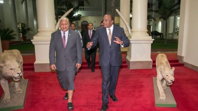Waziri Mkuu wa Fiji, Frank Bainimarama akiwa na Rais wa Kenya Uhuru kenyatta.