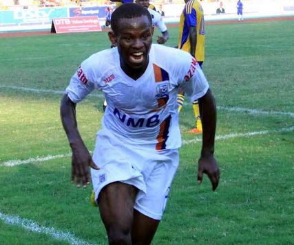 mshambuliaji wa klabu ya soka ya Azam Fc Farid Mussa akishangilia moja bao alilofunga kwenye mechi ya ligi kuu ya soka Tanzania bara