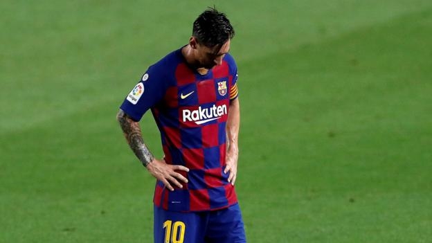 Nahodha wa Barcelona Lionel Messi akiwa na huzuni baada ya Klabu yao kutupwa nje ya michuano ya Ulaya.