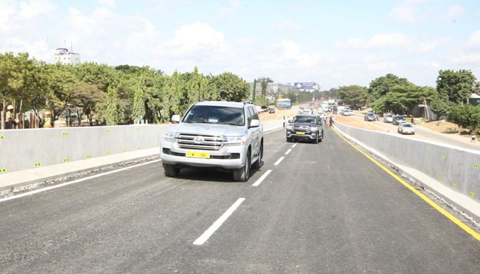 Gari la Waziri wa Ujenzi na Uchukuzi, Profesa Makame Mbarawa, likipita kwenye Flyover ya Chang'ombe