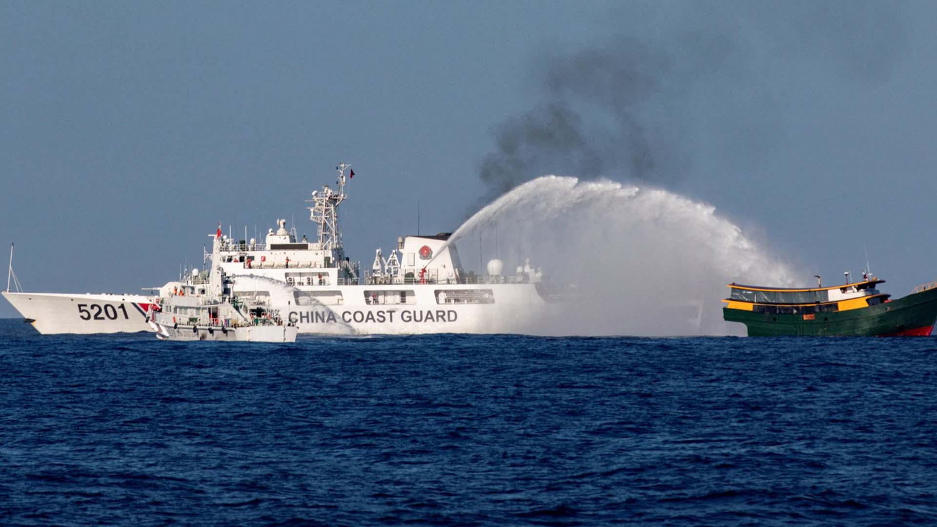 Walinzi wa Pwani ya China wamefyatua maji ya kuwasha kwenye meli za Ufilipino karibu na Scarborough Shoal katika Bahari ya China Kusini, wakiishutumu Manila kwa uvamizi haramu na kugonga moja ya meli zake.