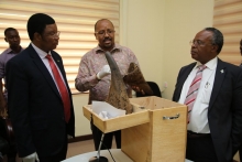 Waziri Mkuu Kassim Majaliwa akipokea pembe za faru.