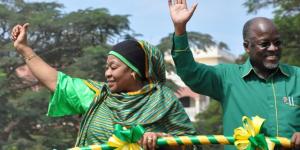 Mgombea Urais kwa tiketi ya CCM, Dk. John Magufuli, na mgombea mwenza wake Samia Suluhu Hassan wakiwapungia mikono wana CCM na wananchi.