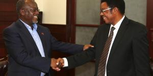 Rais wa Jamhuri ya Muungano wa Tanzania Dkt. John Pombe Magufuli akisalimiana na Inspekta Mkuu wa Polisi Nchini (IGP) Ernest Mangu.