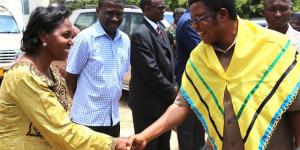 Waziri Mkuu Kassim Majaliwa akisalimiana na Mbunge wa Busanda, Lolesia Bukwimba baada ya kuwasili kwenye Ofisi yaMkurugenzi wa Wilaya ya Chato