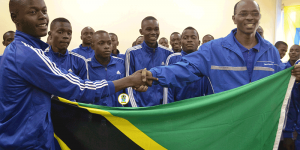 Katibu mkuu wa wizara ya habari,vijana,utamaduni na michezo Profesa Elisante Ole Gabriel akikabidhi bendera ya taifa kwa timu ya taifa ya vijana ya Tanzania chini ya miaka 15.