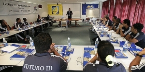Baadhi ya waamuzi na makocha vijana wanaohudhuria semina ya mafunzo ya FIFA kwaajili ya michuano ya Copa coca cola.