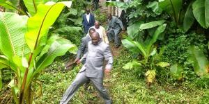 Naibu waziri wa Maji Mhe Amos Makalla akikwepa utelezi wakati akikagua chanzo cha maji ya chemchemu ya Ndoba kijiji cha Galijembe