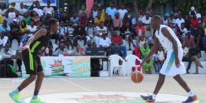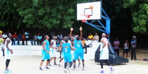 Wachezaji wa TMT na Mchenga BBall Stars (jezi nyeupe) wakiwa katika mpambano.