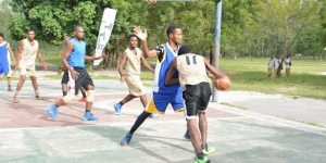 Baadhi ya wachezaji wa timu ya Mchenga Bball Kings na Oysterbay wakati wa mchezo wao leo.