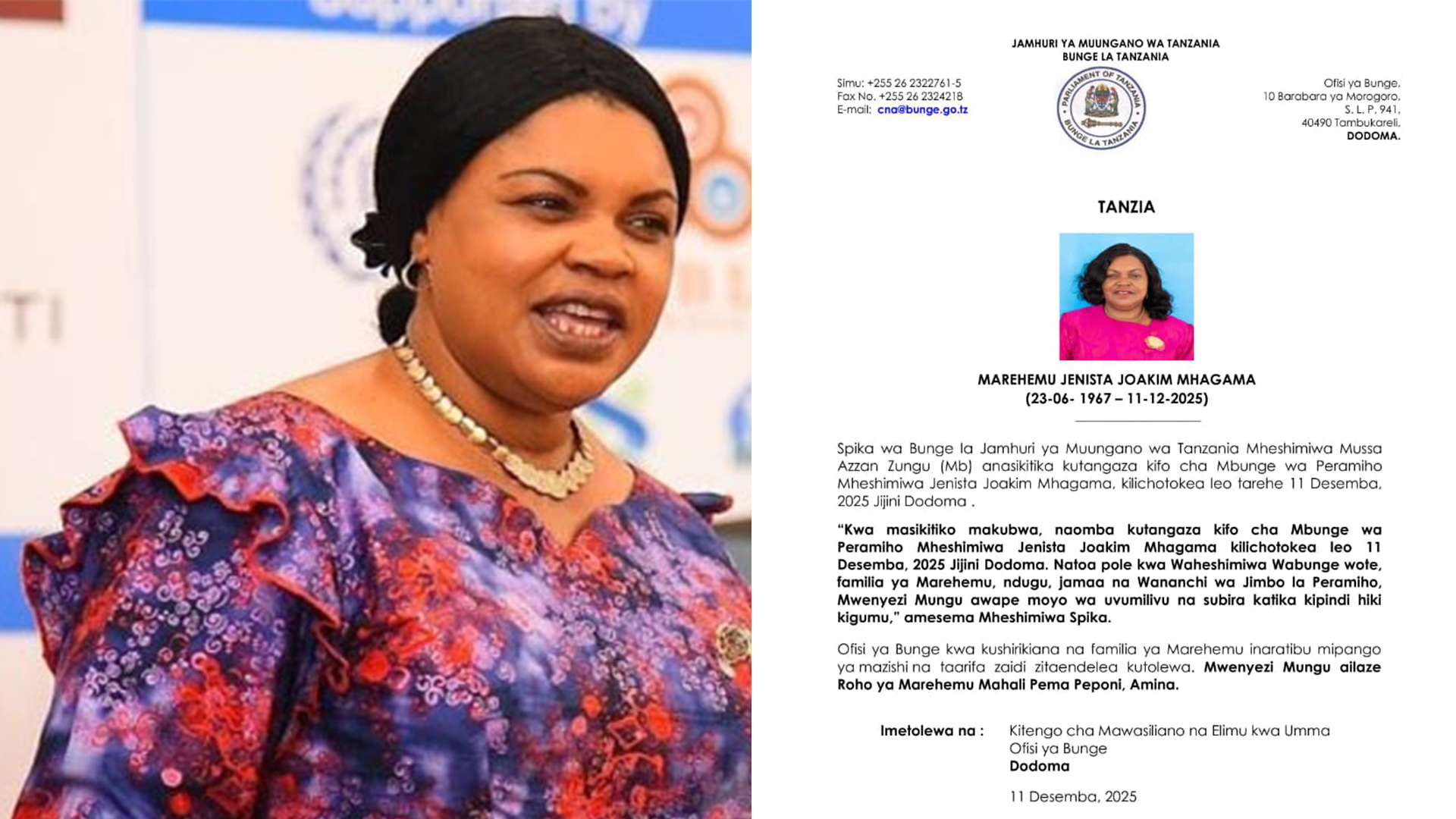 "Kwa masikitiko makubwa naomba kutangaza kifo cha mbunge wa peramiho Mheshimiwa Jenesta Joakim Mhagama kilichotokea leo 11 Disemba, 2025 jijini Dodoma."