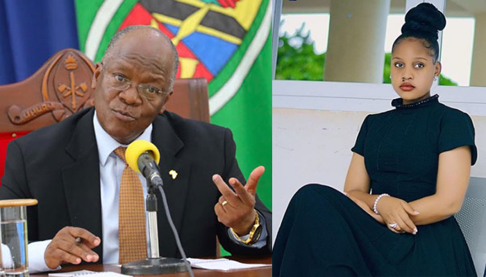 Rais wa Jamhuri ya Muungano wa Tanzania Dkt John Pombe Magufuli na kulia ni Mkuu wa Wilaya ya Kisarawe Jokate Mwegelo.