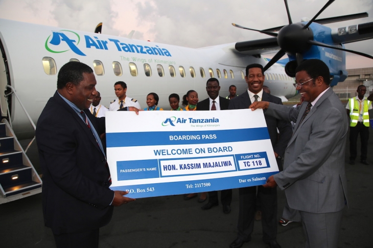 Waziri Mkuu, Kassim Majaliwa akisafiri kwa ndege ya Bombardier Q400 ya Shirika la Ndege la Tanzania (ATCL) kutoka uwanja wa ndege wa Julius Kambarage Nyerere kwenda Dodoma Januari 16, 2017. Alikuwa akizindua safari za ndege za ATCL katika viwanja viwili hivyo. Kushoto kwake ni Katibu Mkuu wa Wizara ya Ujenzi, Uchukuzi na Mawasiliano, Leonard Chamuriho.