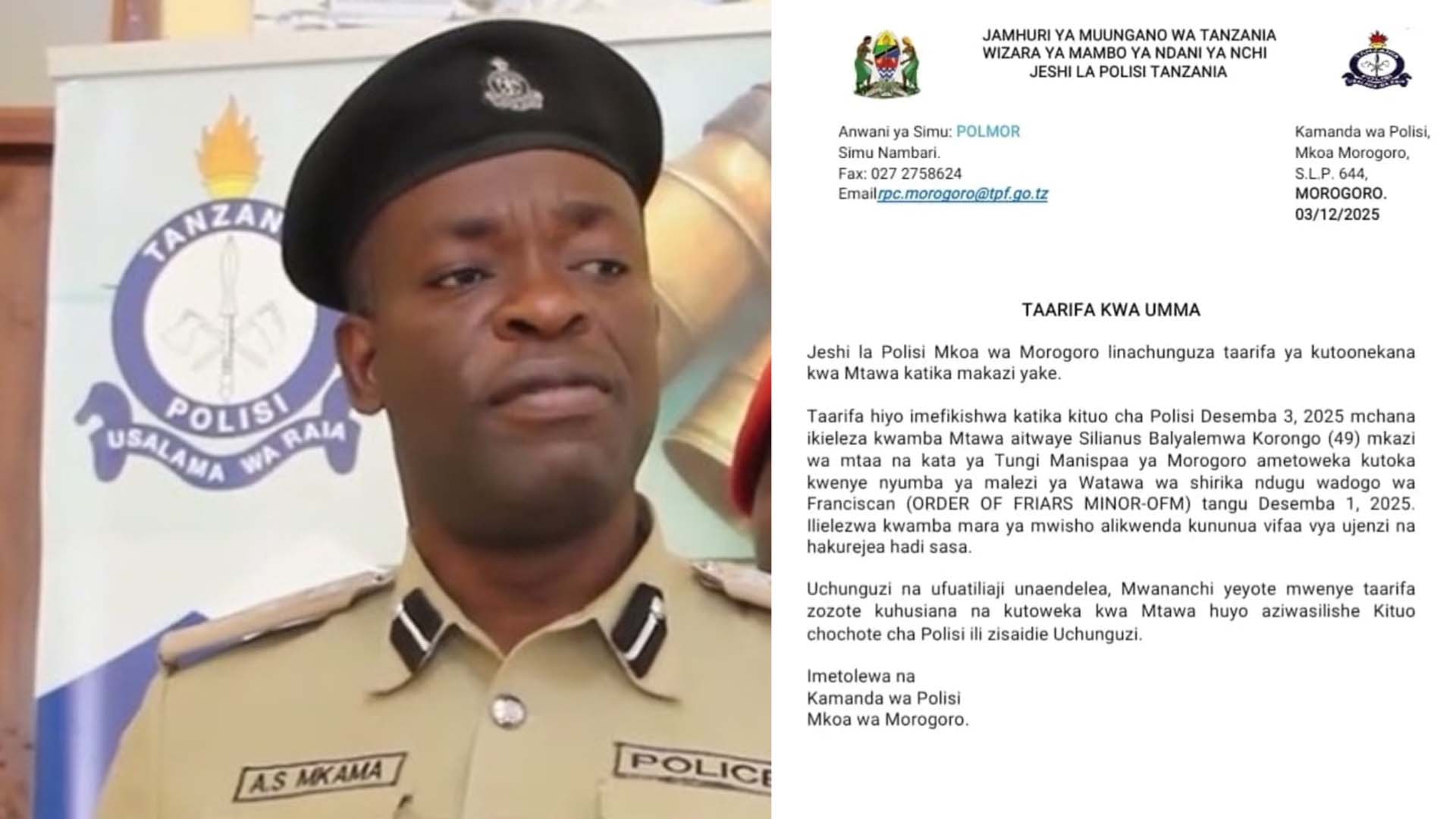Taarifa ya Kamanda wa Polisi Mkoa wa Morogoro, SACP Alex Mkama, aliyoitoa jana Disemba 3, 2025 imeeleza kuwa Jeshi hilo lilipokea taarifa za kutoweka kwa Mtawa huyo, ikieleza kwamba mara ya mwisho alitoka kwa ajili ya kwenda kununua Vifaa vya Ujenzi na hakurejea.