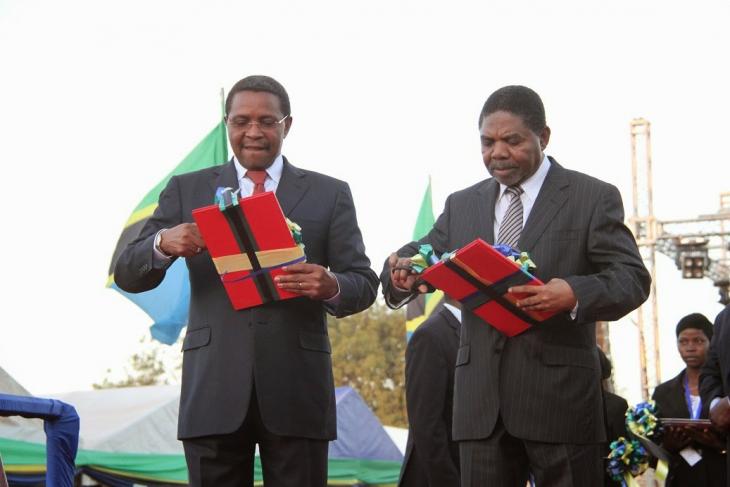 Rais wa Jamuhuri ya Muungano wa Tanzania Dkt. Jakaya Mrisho Kikwete, na Rais wa Serikali ya Mapinduzi ya Zanzibar Dkt. Ally Mohammed Shein, wakifungua katiba inayopendekezwa.