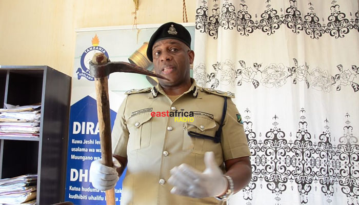 Kamanda wa Jeshi la Polisi mkoa wa Geita, Henry Mwaibambe, akionesha chuma kilichotumika kumjeruhi Askari