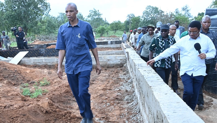 Waziri Mkuu, Kassim Majaliwa akikagua ujenzi wa madarsa ya Shule ya Msingi katika kijiji cha Msomera wilayani Handeni Mkoa wa Tanga kwa ajili ya wananchi walioridhia kuhama katika Hifadhi ya Ngorongoro kwenda kujishi katika kijiji hicho, Aprili 24, 2022. Kulia kwake ni Kaimu Mkuu wa Mkoa wa Tanga na na Mkuu wa Mkoa wa Arusha, John Mongella.
