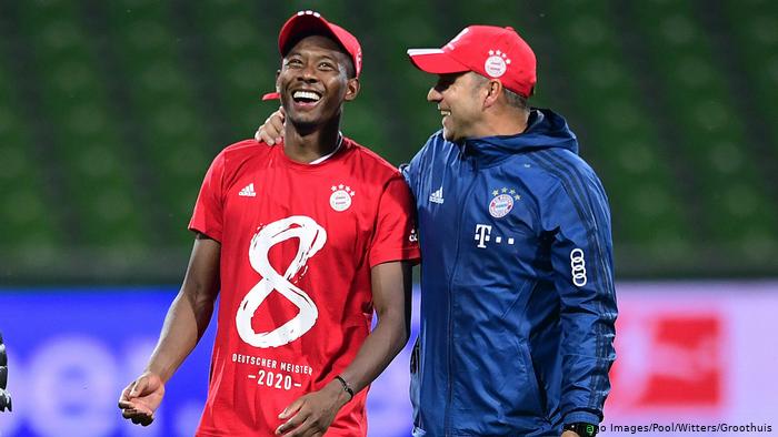 David Alaba (Kushoto) akiwa na kocha wake Hans Flick baada ya kutwaa ubingwa wa 8 wa Bundesilga.
