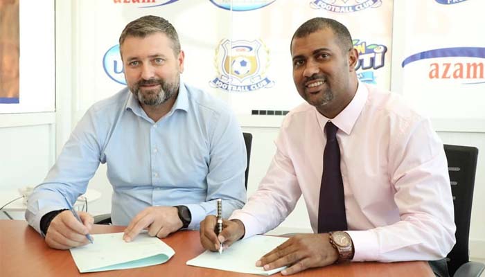 Kocha mpya wa Azam FC, Aristica Cioaba (kushoto) na Afisa Mtendaji Mkuu wa Azam FC, Abdulkarim Amin 'Popat.