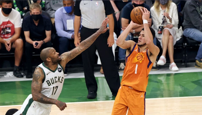 Devin Booker wa Phoenix Suns akijaribu kuurusha mpira ili utinge kikapuni mbele ya P.J. Tucker kwenye mchezo wa fainali ya nne dhidi ya Milwaukee Bucks alfajrii ya leo ambapo Phoenix Suns wamefungwa kwa alama 109-103.