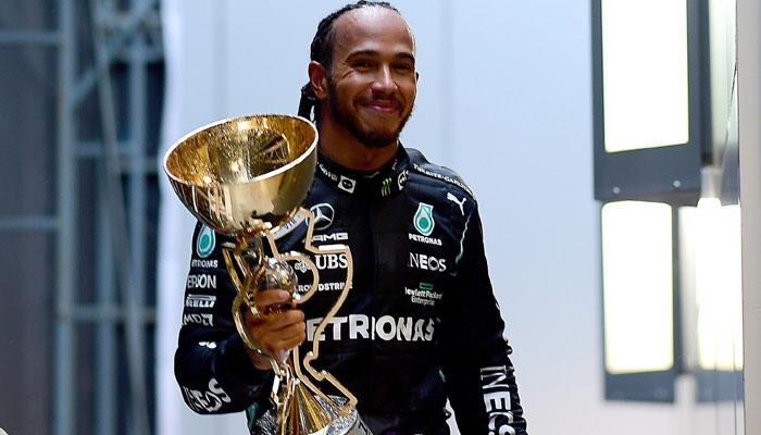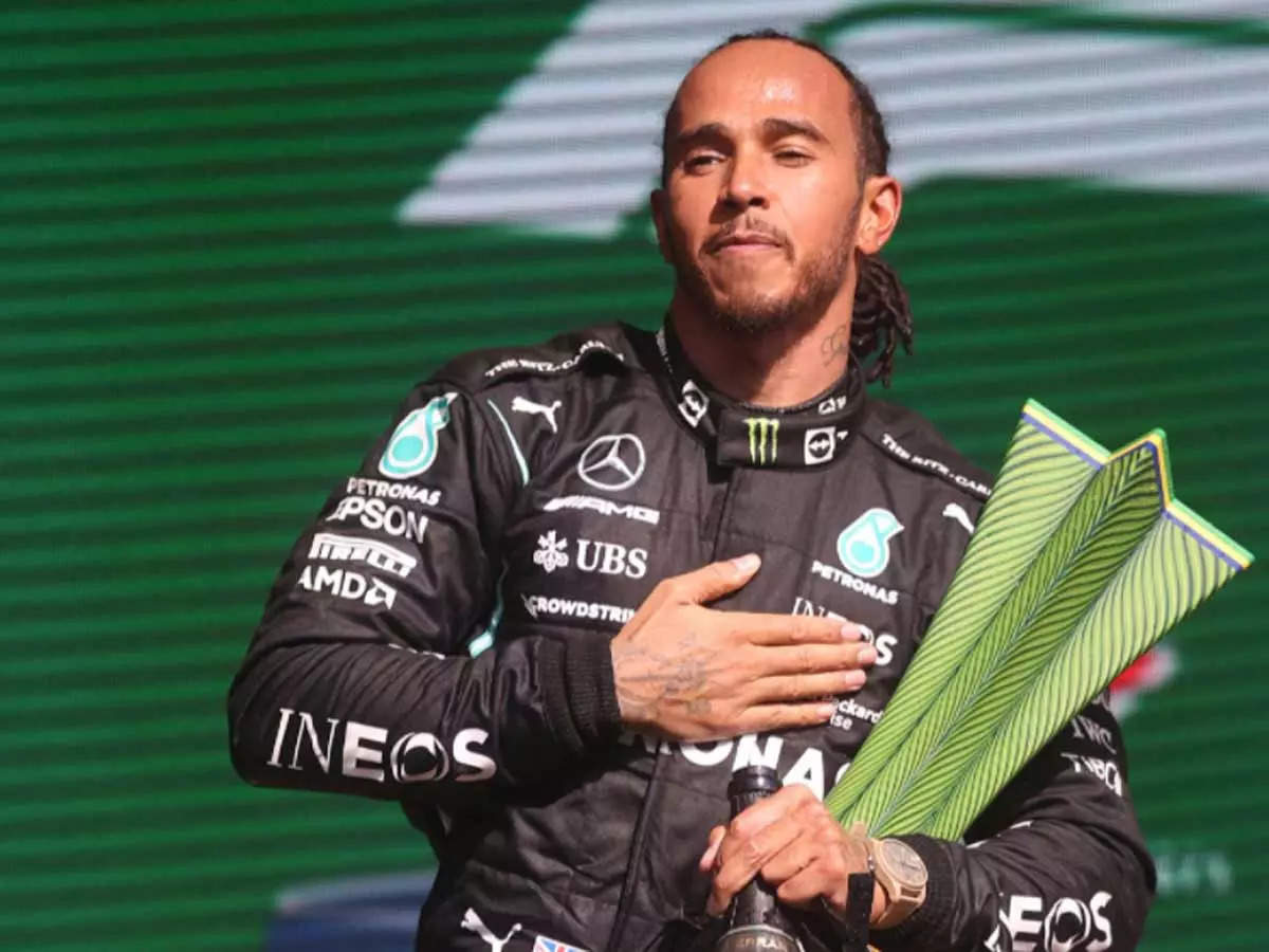 (Lewis Hamilton akiwa na mavazi yenye nembo ya timu yake ya Mercedes)