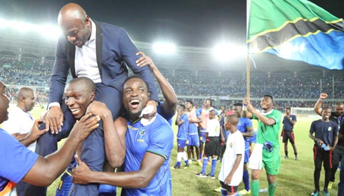 Aliyekuwa kocha wa Taifa Stars, Emmanuel Amunike akiwa amebebwa na wachezaji baada ya kufuzu AFCON