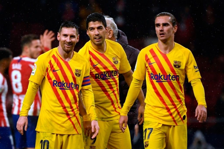 Luis Suarez(kati kati pichani) akiwa akishangilia na Antoine Griezma(Kulia) na nahodha wake Lionel Messi(Kushoto) katika picha.